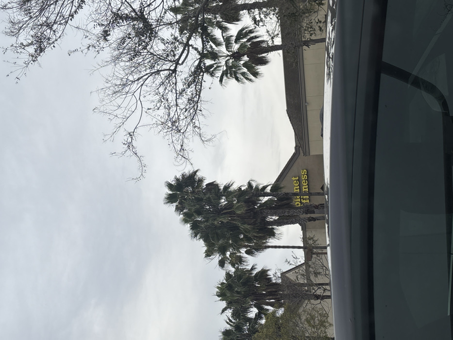 building with the sign "Planet Fitness" on it, lined by palm trees. A leafless tree is visible in the upper left corner. The view appears to be taken from inside a vehicle, with the window frame partially visible on the right side. The sky is overcast and grey.