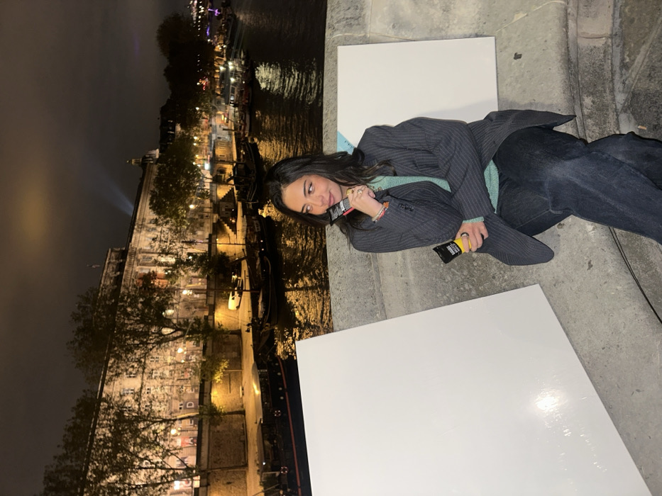 - "A young woman with long, dark hair is seated at night on a gray stone structure, likely a bridge parapet or quay wall, overlooking the Seine River in Paris, France" by FM-KRgCp1, licensed under CC BY 4.0