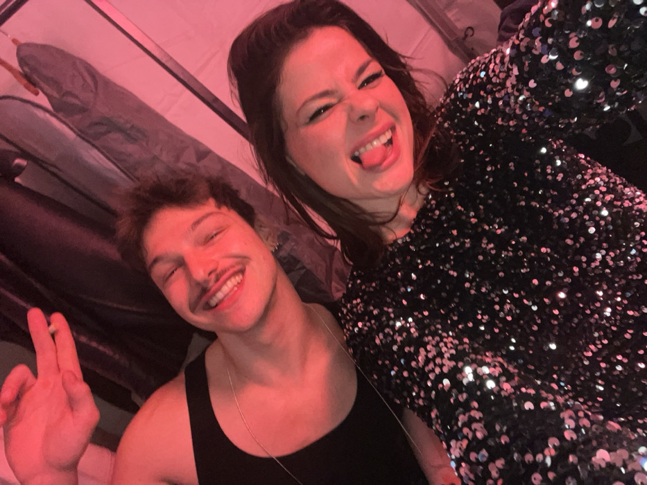 The image captures two individuals, one male and one female, posing for a close-up photograph in an indoor setting illuminated by a prominent red-magenta light source. The male, positioned to the left and slightly behind the female, appears to be a young adult with dark, wavy hair, a thin mustache, and a fair complexion. He is wearing a black sleeveless top and a thin, light-colored necklace. He exhibits a broad smile with his eyes partially closed and is looking towards the camera. His right hand is raised, with the index and middle fingers extended, holding a lit cigarette or hand-rolled item. The female, situated in the foreground on the right, also appears to be a young adult with dark hair and a fair complexion. She is wearing a long-sleeved top densely covered in dark sequins. She is looking towards the camera with a playful expression, her tongue extended, and her eyes squinted, causing her cheeks to rise. The background is indistinct and appears to be composed of dark and lighter draped fabrics or soft walls, suggesting an enclosed, potentially temporary, space. A metal hook or hanger is vaguely visible in the upper right background. The precise location within the city of Dunkirk, France, is not ascertainable from the visual evidence provided in the image.