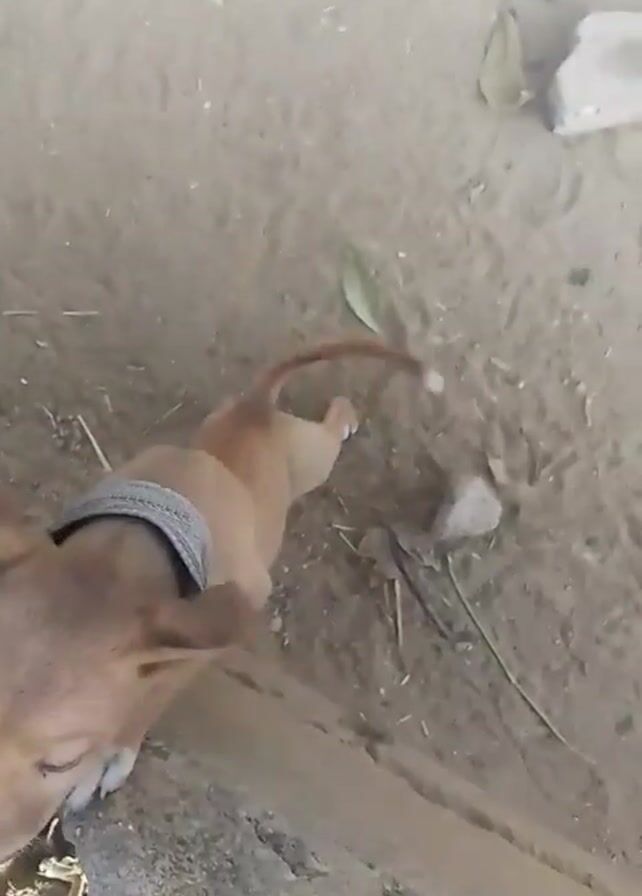 small, light brown dog with white paws and a white tip on its nose standing near a concrete structure with a hole in it. The dog is wearing a grey collar. The ground around the dog and the structure is dirt and small pieces of organic matter. The dog looks down into the hole. It is panting.
