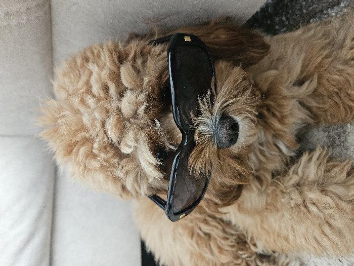 A small to medium-sized domestic canine, exhibiting light brown, curly fur consistent with a Poodle or a Poodle mix, is depicted in a reclining position, facing the viewer. The animal wears dark sunglasses with black frames, featuring gold-toned rectangular accents on the temples. Its black nose and part of its muzzle are visible below the eyewear. The immediate background and foreground consist of light-colored, soft-textured material, indicative of an indoor setting such as upholstered furniture or a carpet. No discernible visual cues within the image provide information regarding a specific geographical location, including the city of Burgas, Bulgaria.