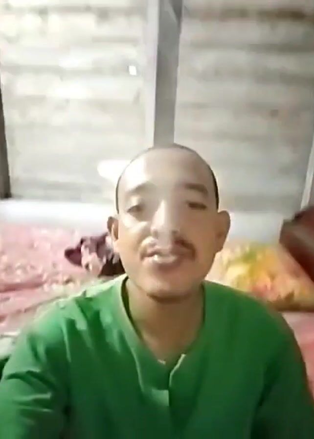A man with a shaved head and a mustache is sitting and looking directly at the camera. He is wearing a green shirt. He exhales vaporized smoke. The background includes a bed with a floral-patterned bedspread, a wooden headboard, and what appears to be a wooden wall.