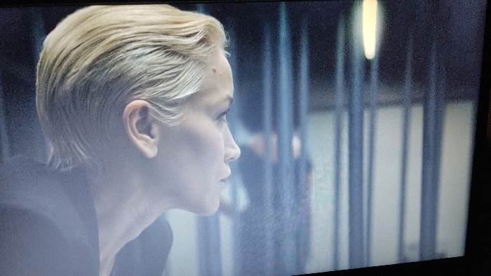 This image displays a female individual in an interior setting in Schiltigheim, France. She is presented in a right-facing profile from the mid-chest upward. Her hair is short, light blonde, and styled, appearing swept back. A small, dark, circular mark is visible on her forehead near the hairline. Her right ear is fully exposed. She is wearing a dark-colored garment, partially visible around her neck and shoulder. Her gaze is directed horizontally towards the right. The background is out of focus, characterized by multiple vertical dark bars or pillars. Beyond these structures, a blurred light-colored area is present. In the upper right quadrant of the background, a distinct, bright, vertical light source is visible. The overall image exhibits significant digital noise.