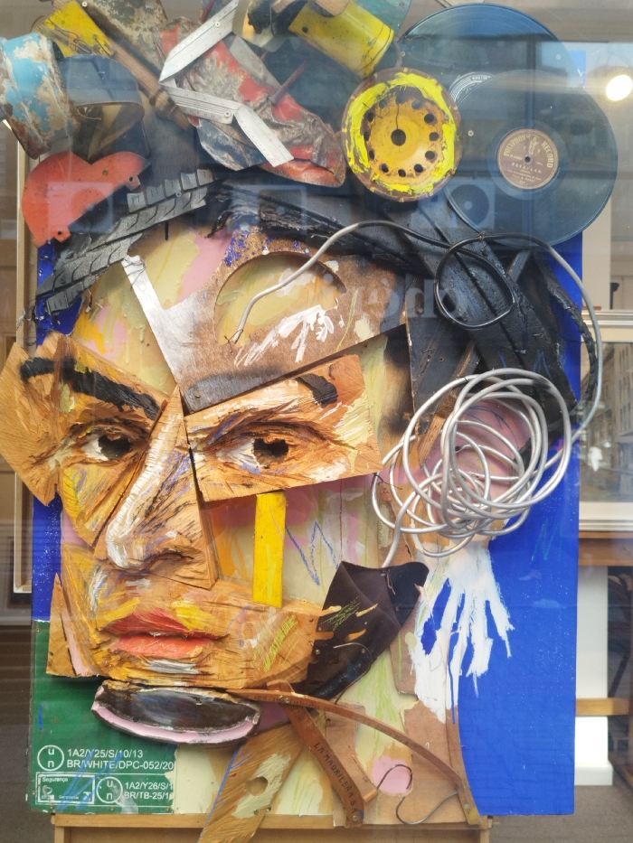 The image displays a mixed-media portrait with a cubist influence. The face is constructed from wood fragments, vividly colored. The eyes are striking, and the mouth is rendered with red hues. The background features a vibrant blue and a collection of seemingly random objects, including vinyl records, metal scraps, and painted elements. At the bottom, text and symbols are partially visible, adding a layer of complexity to the artwork.