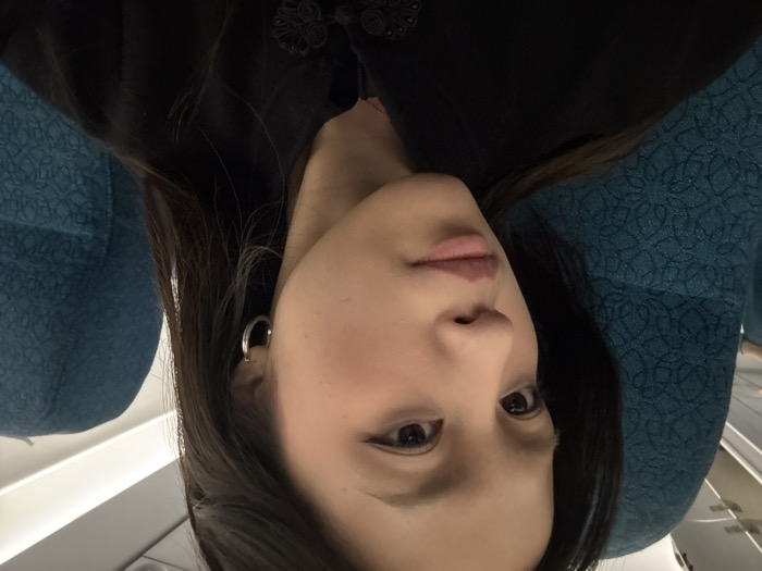 A close-up portrait depicts a young East Asian female seated within an aircraft cabin
