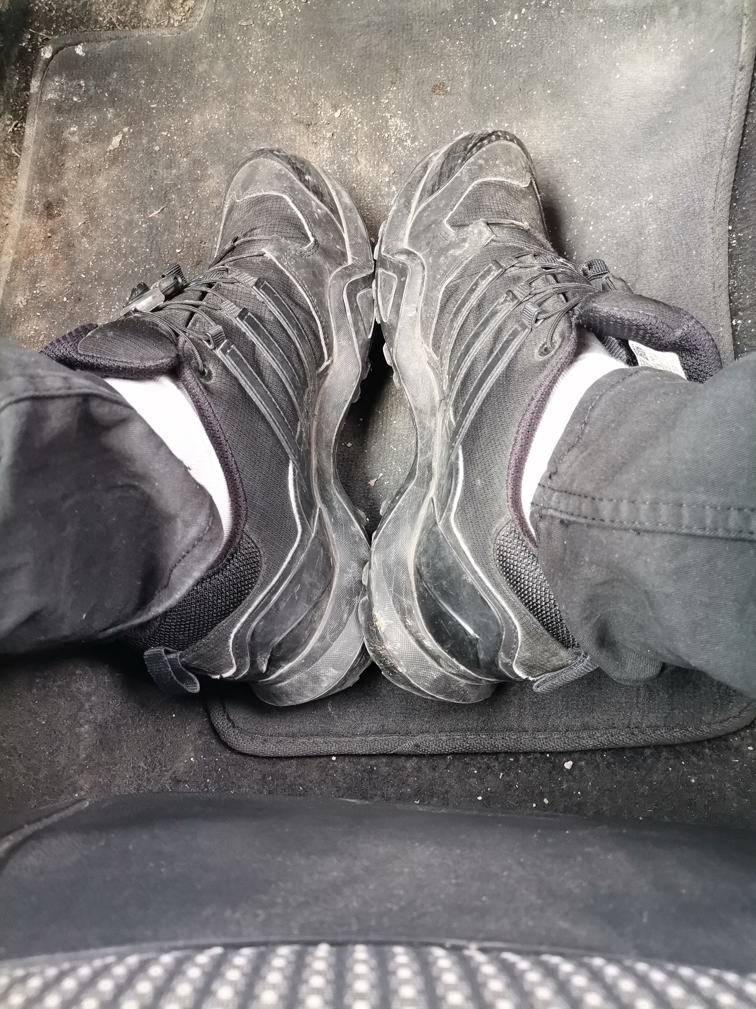 The image depicts a pair of dirty black Adidas Terrex hiking shoes on a dark-colored floor mat, likely inside a vehicle