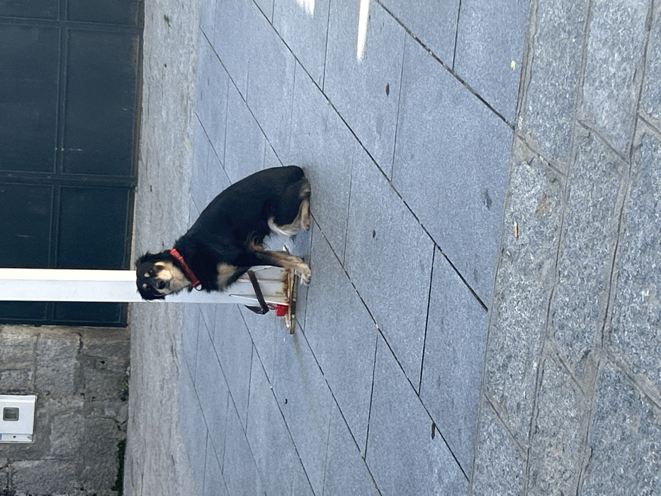 The scene is a paved street in El Espinar, Spain. A medium-sized dog, characterized by black fur with tan markings on its muzzle, eyebrows, chest, and front legs, sits facing slightly left of the viewer. It wears a red collar and is attached via a dark leash to a white vertical pole showing rust at its base. A small red object is present near the pole's bottom. The ground surface consists of neatly laid grey granite tiles in the midground, transitioning to a rougher, dark grey granite block paving in the foreground. To the left background, a stone wall with a white electrical utility box is visible. To the right background, a dark, vertically paneled metal gate is present. Strong sunlight illuminates the scene, casting defined shadows. A single cigarette butt is visible on the granite block paving in the lower right. No human individuals are depicted.