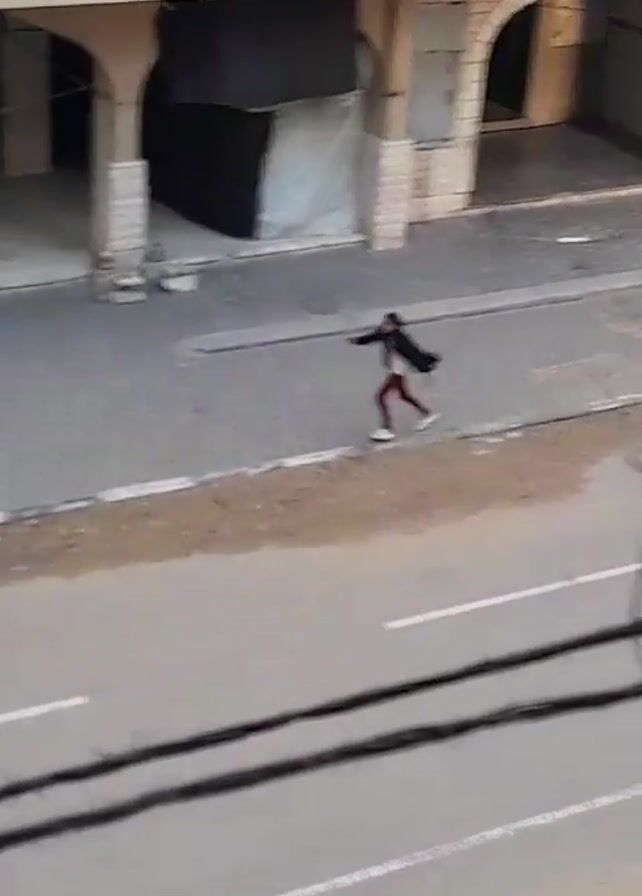 three people and what appears to be a low-traffic street next to a building. One individual in a black jacket and dark pants with white shoes is on the sidewalk, gesturing towards the street, while two smaller individuals run towards them. The first child, wearing a light-colored jacket, joins the first individual on the sidewalk. The second child, wearing a dark jacket and pants, continues running in the street towards the group. The location appears to be an urban residential area with a building featuring arches and open parking spaces.