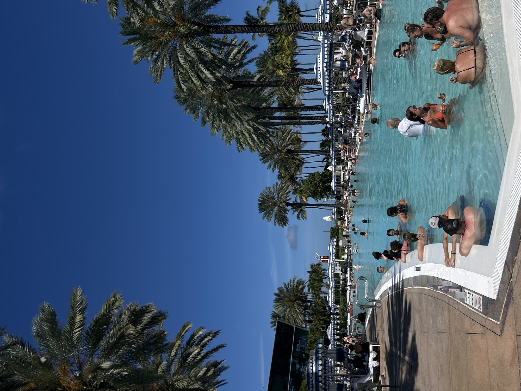 The image depicts a scene at a crowded swimming pool in Miami Beach, Florida, United States. Numerous people are in the pool and surrounding areas, some swimming, others standing or sitting near the edge. Some are wearing swimsuits or casual clothing. The pool is lined with a white border, and a walkway is present next to it. Palm trees are visible in the background, suggesting a tropical or coastal environment. The sky is clear and blue. The location appears to be an outdoor pool area, possibly part of a resort or hotel. There are deck chairs in the background with many umbrellas offering shade.