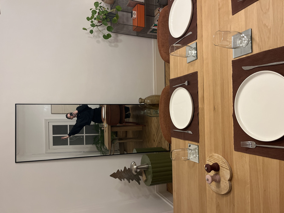 A dining table for four is set with white plates, brown placemats, silver cutlery, and clear glasses. A plant sits atop a metal shelving unit against a white wall. A full-length mirror reflects a woman taking a picture of herself. The reflection shows a dining area with a table, chairs, and greenery by a window. A wooden decorative piece is attached to the table's side.