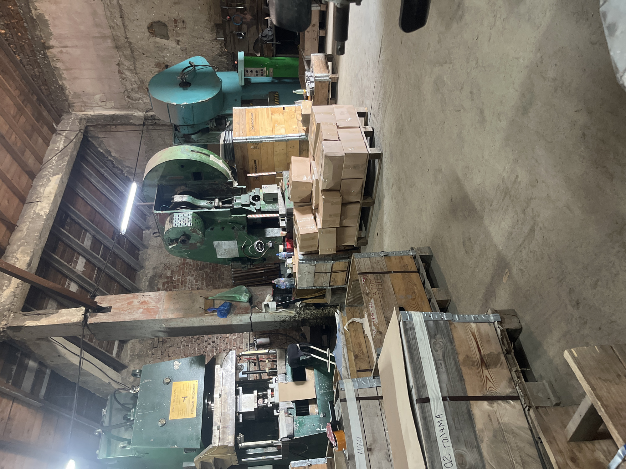 The image depicts the interior of a warehouse or industrial space, possibly located in or near Balgarevo, Bulgaria. There are several large, heavy industrial machines present, appearing to be metal presses, arranged in a row along the left side of the frame. Adjacent to the machines are stacks of wooden crates and pallets, some with cardboard boxes placed on top. The boxes appear to be new and possibly filled with manufactured goods. The general impression is of a space used for storage and industrial operations. The warehouse shows signs of age, with exposed brick walls and beams. The lighting is dim, and there does not appear to be anyone in the image. Labels in Cyrillic text appear on some crates. The floor appears to be concrete and unfinished.