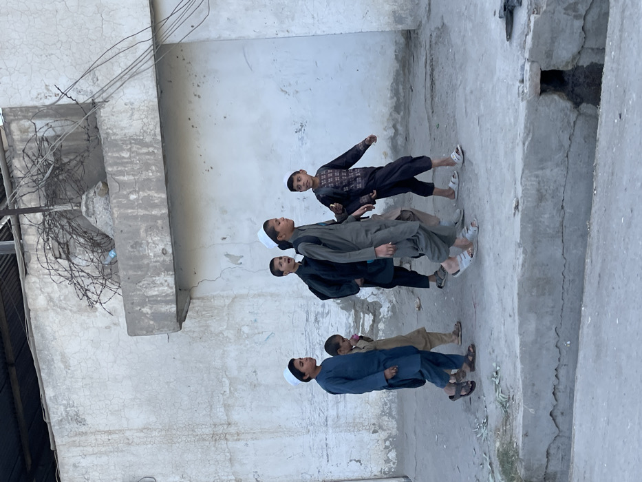 The scene depicts six male children walking from left to right across a paved surface in an urban or semi-urban area within the city of Unknown, Unknown. **People:** Six boys, ranging in apparent age from approximately 5 to 12 years old, are in various stages of walking. Five of the boys wear white skullcaps. 1. The leftmost boy wears a dark blue long tunic and trousers with dark sandals. 2. A younger boy follows, wearing a light brown long tunic and trousers with dark sandals, holding a pink object near his mouth. 3. Next, a boy wears a dark blue tunic and trousers with a dark backpack and sandals; his mouth is open, suggesting speech or expression. 4. Following him, another boy wears a dark grey-green tunic and trousers with light-colored slide sandals and a dark backpack; he holds a small, light-colored object in his right hand. 5. A fifth boy is partially obscured behind the fourth, wearing similar attire. 6. The rightmost boy wears a dark blue tunic with a patterned chest, dark trousers, and white slide sandals. He is looking slightly to his left. **Environment:** The ground is a cracked, grey concrete or asphalt surface. A low concrete curb or wall runs across the foreground, featuring a small square drain opening on the right side. Sparse green foliage or debris is visible near the curb on the left. The background consists of a tall, light-colored concrete or stucco wall showing extensive cracking, staining, and peeling. Above this wall, a concrete ledge or beam is visible, upon which a tangled mass of barbed wire is situated, along with a small blue plastic bottle. Multiple dark utility wires drape from above the ledge towards the right. Above the ledge, a corrugated metal roof is partially visible. **Actions/Interactions:** All six boys are actively walking in the same direction, suggesting collective movement. Their proximity and the open mouth of one boy indicate potential communication or group activity. **Objects:** Notable objects include five white skullcaps, two backpacks, a pink object, a small light-colored object, a tangled mass of barbed wire, a blue plastic bottle, utility wires, and a concrete drain.