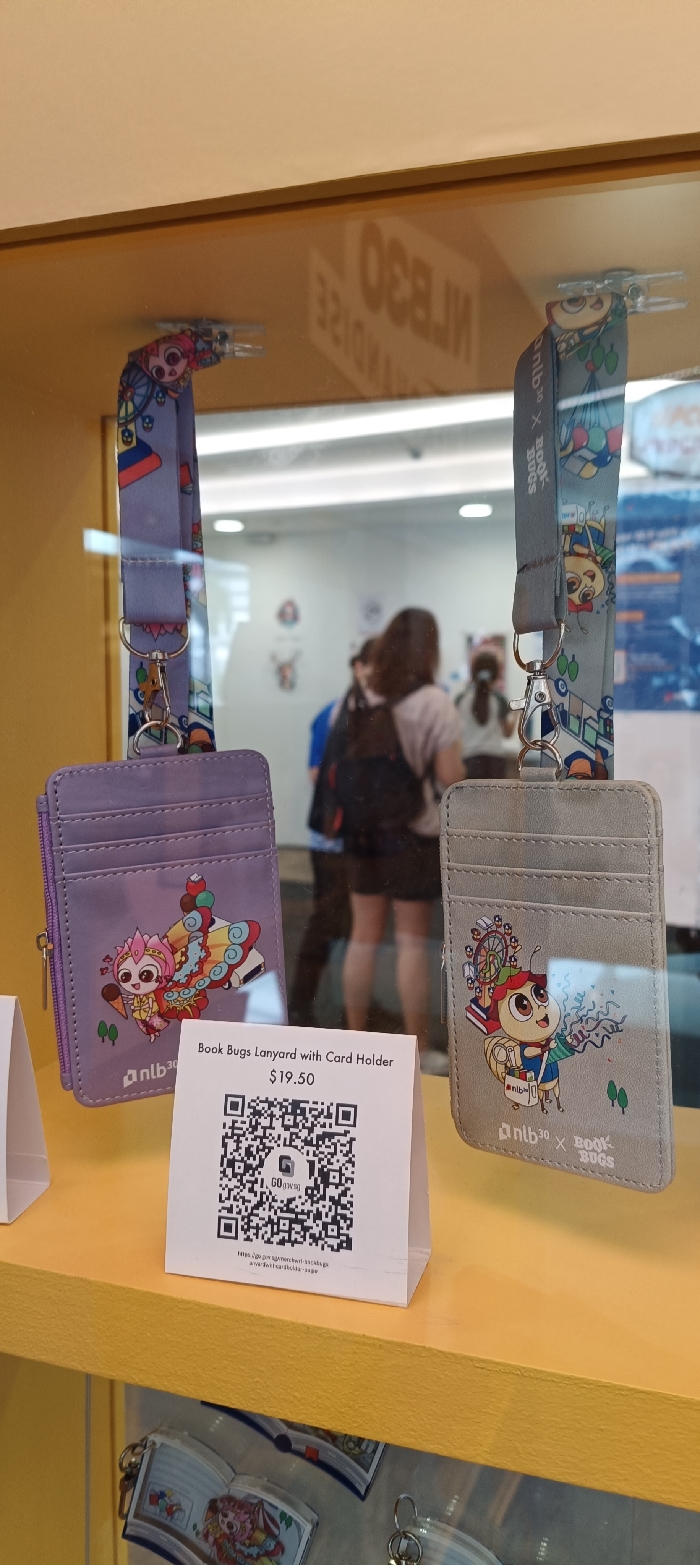 A display features two "Book Bugs" lanyards with cardholders. The lanyard on the left is lavender with a butterfly character, while the one on the right is gray with an ant-like character and a ferris wheel. A small white sign advertises the "Book Bugs Lanyard with Card Holder" for $19.50 and includes a QR code. The branding on the lanyards and sign indicate a collaboration between "nlb 30" and "Book Bugs."