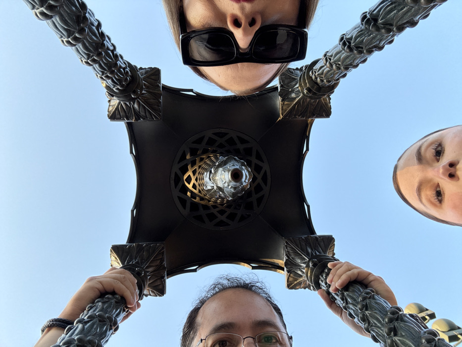 A low-angle shot features three people surrounding a tall, ornate lamppost. The woman at the top wears sunglasses, with the lamp directly below. To the right, another woman's face is partially visible. Below the lamp, a man holds the post, his face also partially visible. The light blue sky is visible in the background. The lamp itself is dark in color with decorative patterns.
