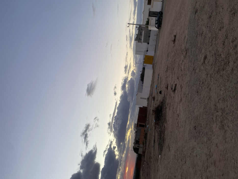 The photograph depicts a serene sunset over a suburban landscape. The sky transitions from a light blue hue to a warm orange at the horizon, punctuated by scattered clouds. Buildings line the right side of the frame, adding a touch of urban contrast to the natural scene. The ground is primarily a dusty beige, with bits of debris scattered across. A solitary utility pole is visible.