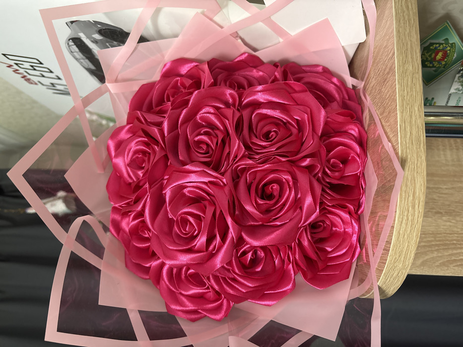 - "A fuchsia satin ribbon rose bouquet, wrapped in light pink tissue and clear cellophane with pink borders, rests on a light wood-grain surface" by FM-oZ3fG3, licensed under CC BY 4.0