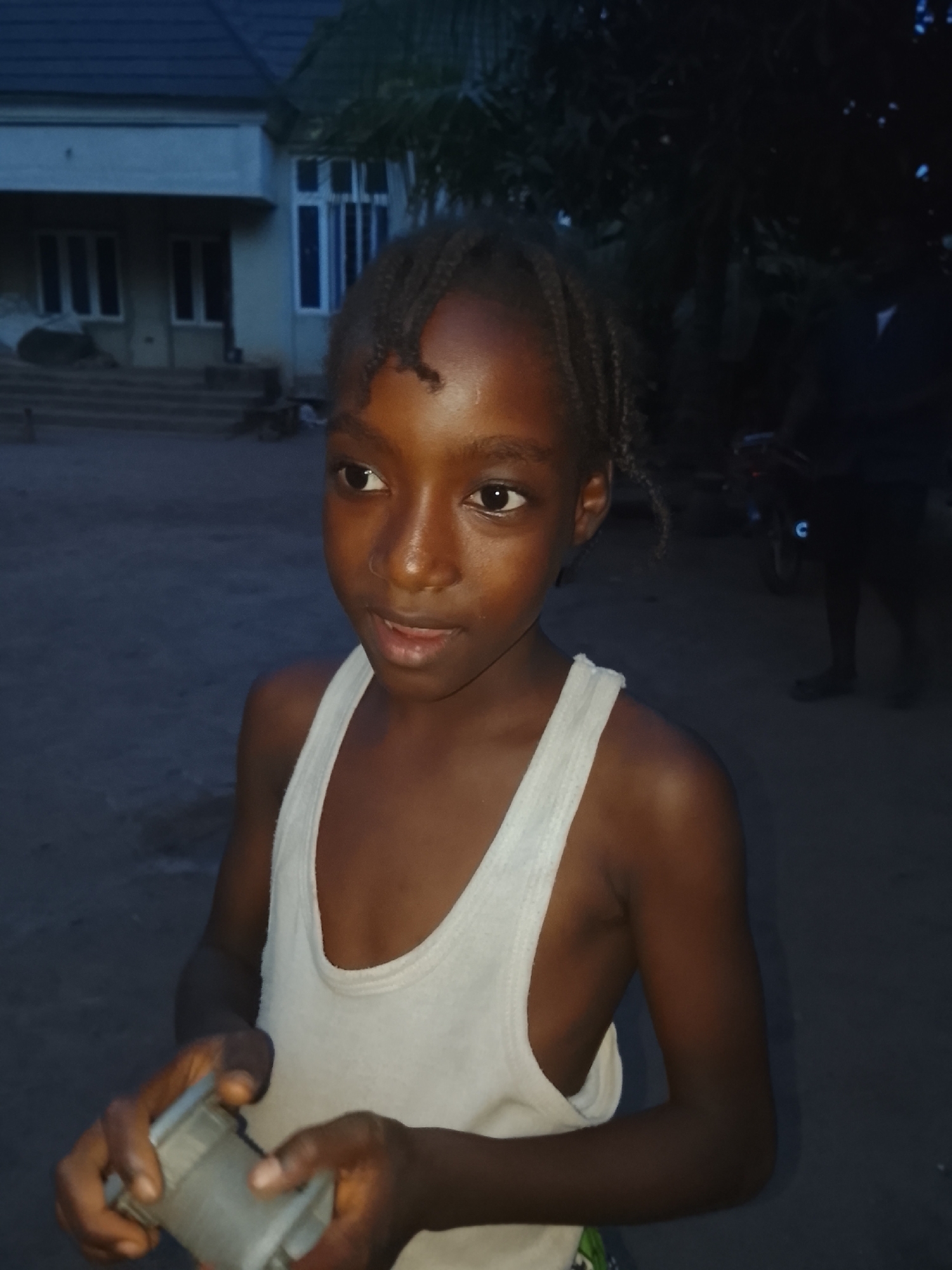 The image displays a young individual of dark complexion, appearing to be a child, centered in an outdoor, low-light setting in Akwanga, Nigeria