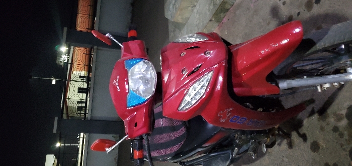 - "A red scooter is angled diagonally against a blurred background, featuring a building with lit windows on the left and a concrete surface below" by FM-JwA7r1, licensed under CC BY 4.0
