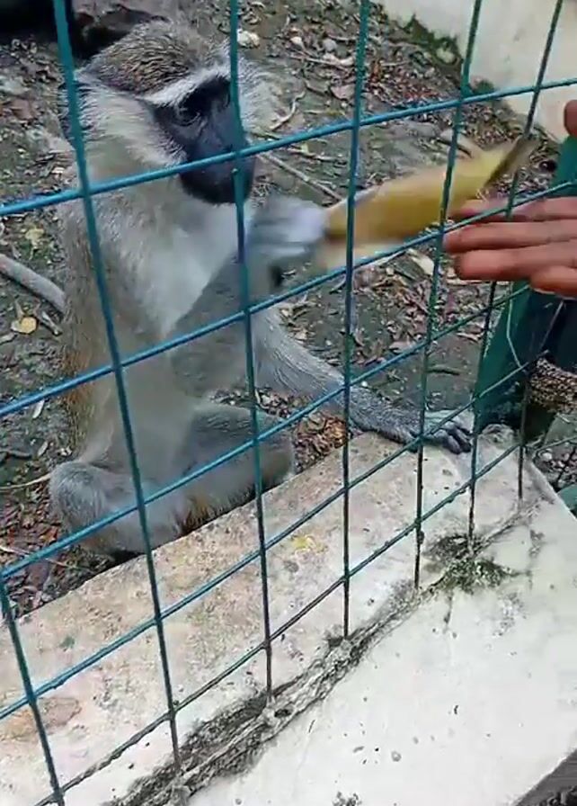 A medium shot shows a grey monkey in an enclosure, sitting in front of a teal-and-green fence, extending its arms along the bottom of the fence towards the camera