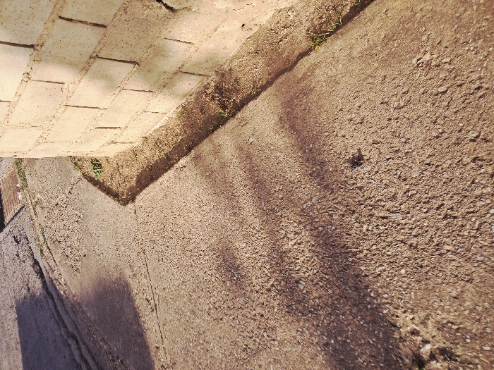 The scene depicts an outdoor ground-level view in Juan Griego, Venezuela. The primary subject is a textured, light brown concrete surface that appears uneven, showing minor cracks and scattered small debris. To the right, a curved wall, constructed from light-colored concrete blocks, rises vertically. A narrow strip of dry earth containing sparse, short green and brown vegetation is present between the concrete surface and the base of the wall. Strong, directional sunlight casts multiple shadows across the scene: a large, irregular shadow occupies the upper-left quadrant of the concrete, and distinct linear shadows are visible across the central paved area and along the base of the curved wall. No human figures or animals are present.