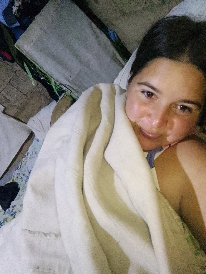 A woman is nestled under a white blanket, presumably indoors. Her face is visible, showing soft features and a gentle smile. The background is slightly cluttered with various items, possibly including pillows, fabric, and other household objects. The lighting appears soft and somewhat dim, creating a cozy atmosphere. The overall impression is one of comfort and relaxation.
