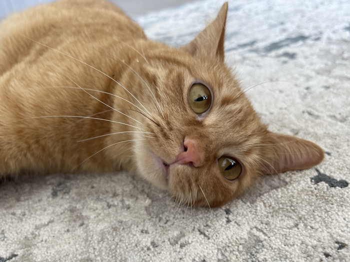 - "ginger cat lying on a light grey and white patterned rug, looking directly at the camera with large, round, golden eyes" by FM-ZrGmT2, licensed under CC BY 4.0