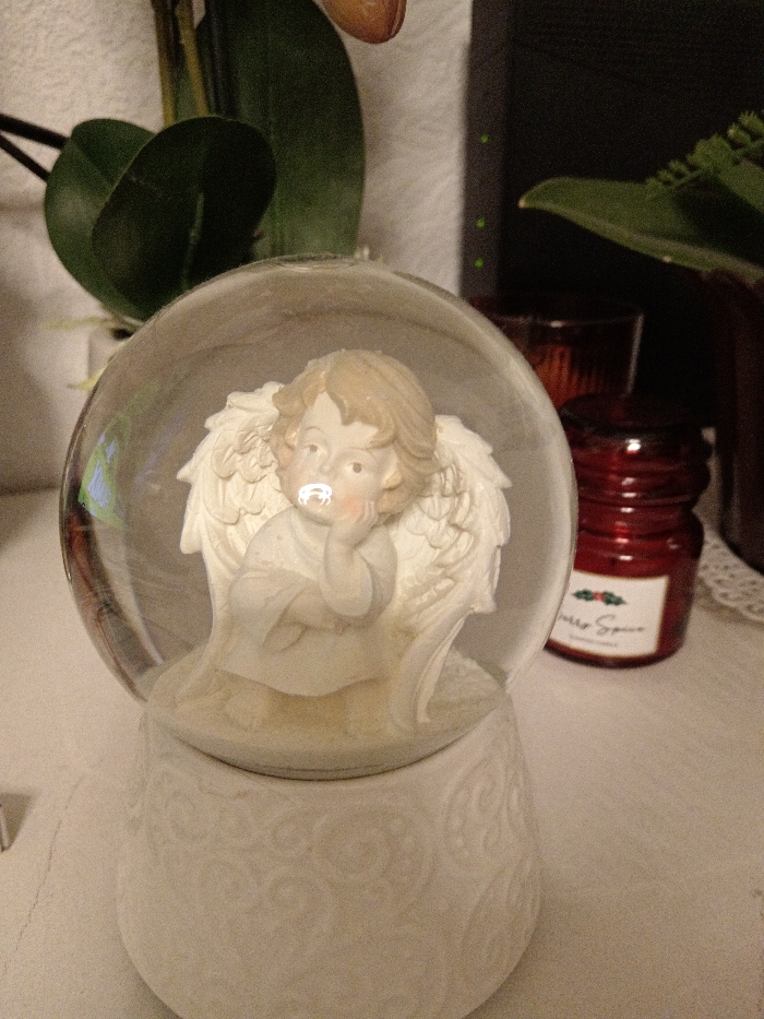A snow globe features a white, winged angel with a pacifier, posed thoughtfully on a decorative base