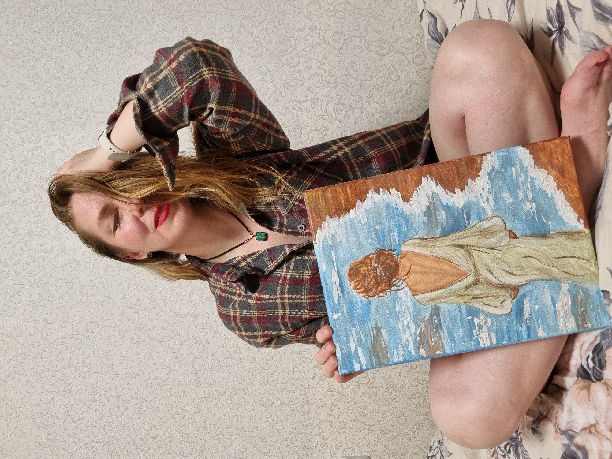 A woman is lying on a bed with a floral-patterned blanket and holding a painting in her hands. She is wearing a plaid flannel shirt and a necklace with a green pendant. She has blonde hair and red lipstick. The painting depicts a woman in a white dress with a tan back and blonde hair against a blue and brown background. The background behind her is a textured, off-white wall. The photo was taken indoors in Chaikovsky, Russia.