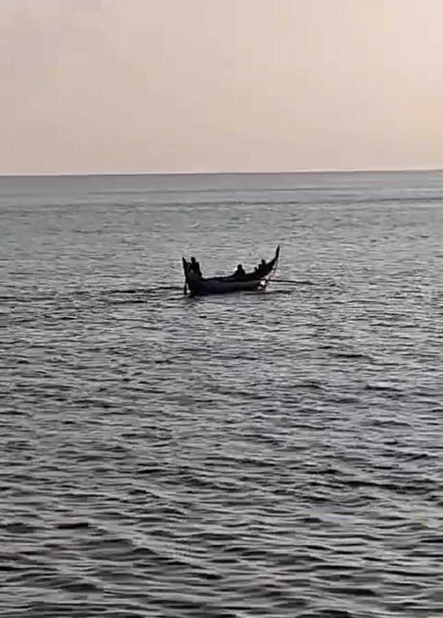 A low-angle shot shows a small, dark-colored boat moving across a body of water. The boat is populated by several silhouetted figures. The water is rippled with small waves. The sky is a pale, even color, suggesting it might be dawn or dusk. The boat appears to be moving away from the viewer. The scene is generally calm.