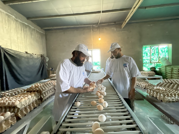 An indoor scene in Shuyene Vosta, Afghanistan, depicts an egg processing facility