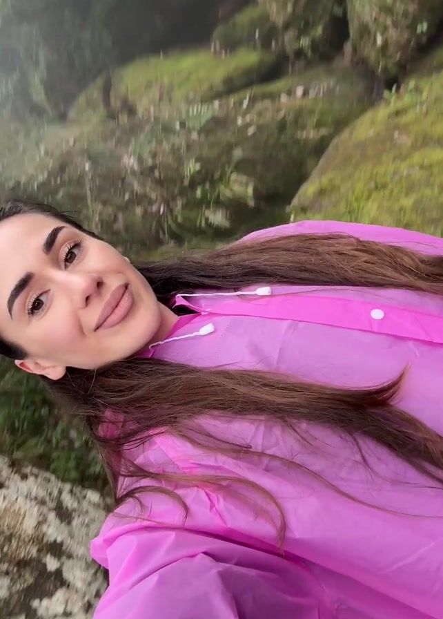 A woman wearing a pink plastic poncho is recording a video of herself in a lush, rocky forest. She is smiling. The background consists of moss-covered rocks and greenery. The day appears overcast and possibly misty.