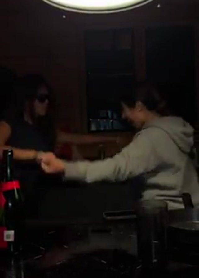 Two women dance in a kitchen. One wears sunglasses and a black t-shirt. The other wears a grey sweatshirt. A bottle of red wine and two glasses sit on the counter. A window is behind them, and a round light fixture illuminates the room. The women hold hands and twirl each other. The video is taken at eye level.