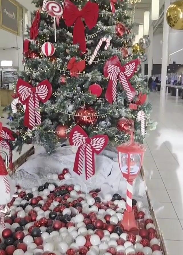 decorated Christmas tree in an indoor shopping center. The tree is green and decorated with red and white striped bows, red and white lollipop decorations, candy canes, and shiny red ornaments. The tree stands on a base covered with a layer of white material that resembles snow. Surrounding the base is a collection of white, red, and dark gray ornaments contained by a short white picket fence. A red and white candy cane-striped lamppost sits on the base beside the tree. In the background, there are stores and people walking through the shopping center. The lighting is bright, typical of a commercial space.