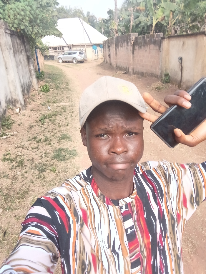 A person with a beige cap and patterned shirt stands on a dirt path. The individual holds a black smartphone to the side. Behind the person are concrete walls on both sides of the path. In the distance is a house with a white roof and a silver car. The surrounding area has trees and vegetation. The image has an outdoor setting with natural lighting.