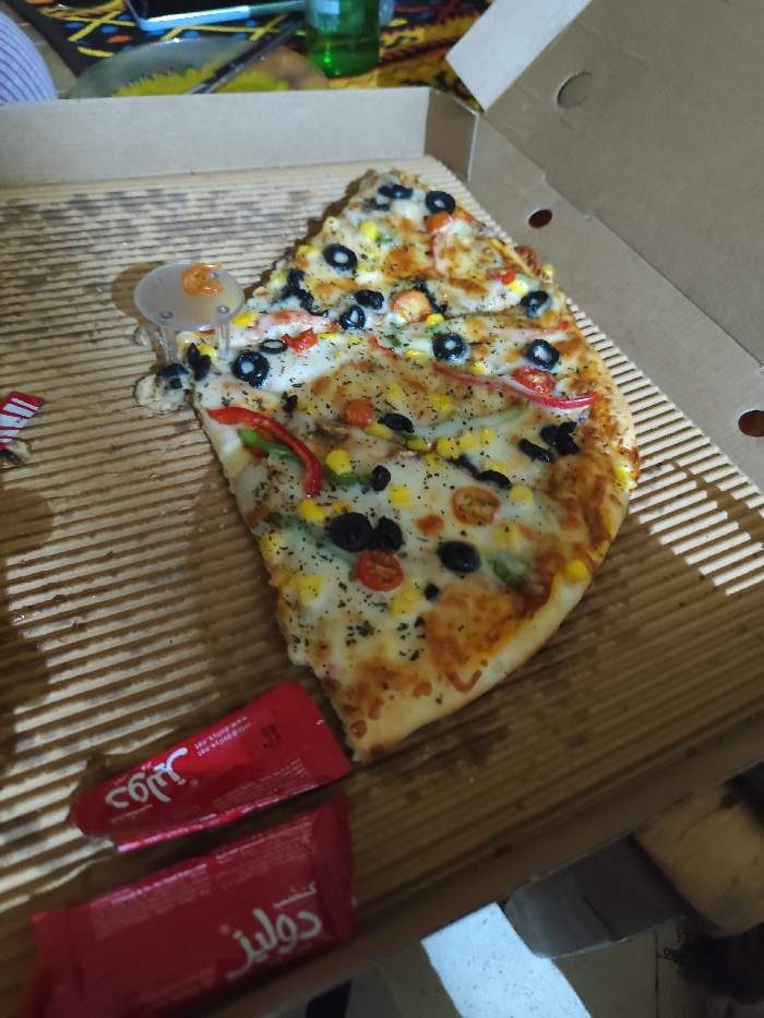 The scene depicts a partially consumed pizza within an open, rectangular, corrugated cardboard delivery box. The pizza, approximately half remaining, consists of two visible slices adorned with diverse toppings, including black olives, yellow corn kernels, red bell pepper strips, small red cherry tomato halves, and dried herbs on a melted cheese base. A clear plastic pizza saver, or tripod, stands between the remaining slices, containing a small amount of orange liquid residue. The interior of the cardboard box exhibits grease stains and minimal food remnants. To the lower left of the pizza, two red, individual-serving condiment sachets are present. Each sachet displays "Dooly.net" in English and "دوليز" in Arabic text. In the blurred background, outside the pizza box, a green bottle, a mobile phone, and a multi-colored patterned fabric (likely a tablecloth or rug) are partially visible. The setting is in As-Salihiya Municipality, Syria.