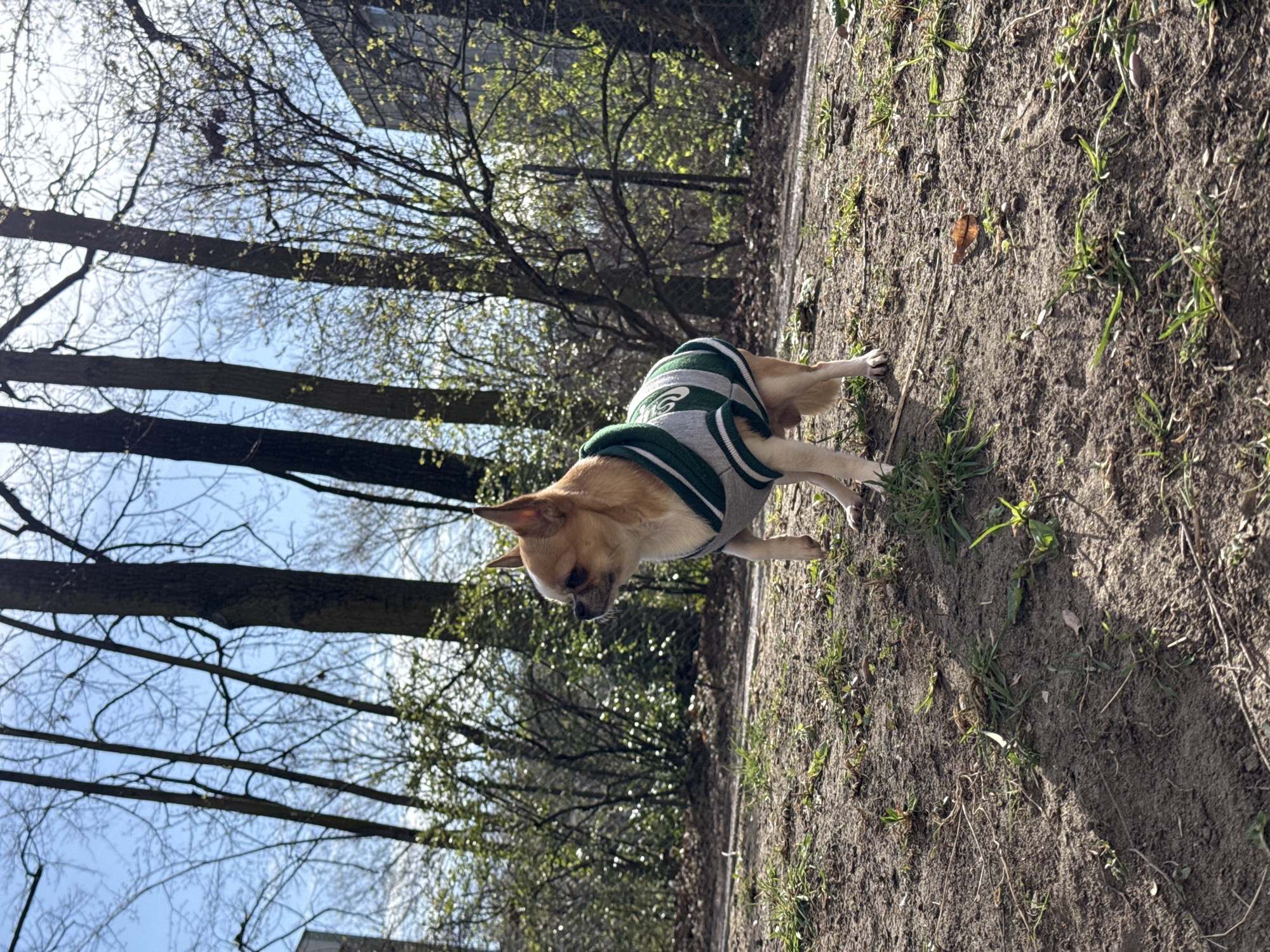 A light brown and white Chihuahua, wearing a grey and green striped sweater, stands in profile facing left on a patch of uneven soil sparsely covered with green grass, dry leaves, and twigs. Its left front paw is slightly elevated. Distinct shadows are cast on the ground from an unseen source to the left of the frame. The background consists of numerous deciduous trees with bare branches and some bushes beginning to show nascent green leaves, indicative of early spring. A clear blue sky is visible through the upper tree canopy. In the far upper right background, a portion of a multi-story building with visible windows can be seen. The scene is brightly illuminated by direct sunlight. This event occurs in a park setting within the city of Berlin, Germany.