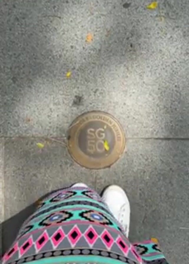 person standing on a gray tiled surface. The person is wearing white sneakers and a colorful patterned skirt. A circular metal marker is embedded in the ground in front of the person's feet. The marker reads "WALK SG GOLDEN JUBILEE SG 50 2015." There are a few small yellow leaves scattered on the ground. The scene is outdoors, with some shadows from above visible on the ground.