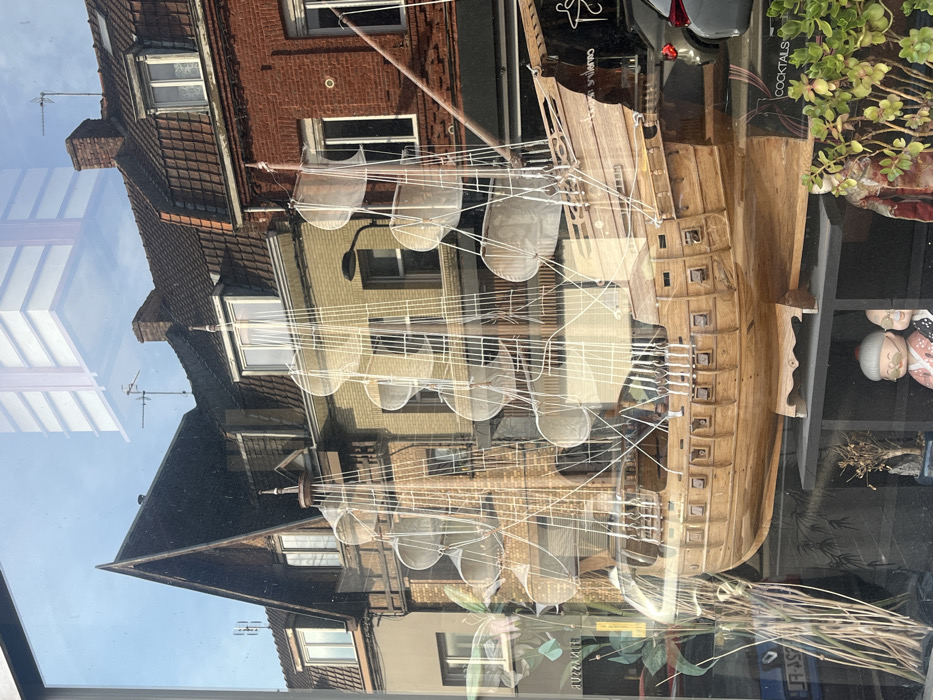 An eye-level photograph captures a view through a large storefront window in Croix, France, presenting an interior display overlaid with reflections of the street scene. The dominant subject inside the window is a large, light-brown wooden model of a three-masted sailing ship, resembling a galleon, complete with intricate rigging and multiple white, furled sails. It is positioned on a dark shelf, where two small, ceramic figurines of elderly individuals with spectacles and traditional attire are also displayed to the left of a small dried plant in a pot, and to the right of a small green potted plant. Faint white text reading "COCKTAILS" is visible on the lower right of the glass. The exterior reflections, superimposed over the interior display, depict a clear blue sky and a row of multi-story buildings across the street. These include, from left to right: a building with a steep, dark gable roof and a dark timber-framed upper facade; a light yellow building with a brown tiled roof; and a red brick building with a brown tiled roof, all featuring dormer windows and rooftop antennae. A street light pole is visible between the yellow and red buildings. A partial reflection of a silver vehicle and a clothing store logo (hanger icon) are present on the right, while reversed text, possibly part of "RESTAURANT," is faintly visible on the far left. A reflection of a light-colored building with horizontal bands is visible in the upper sky area.