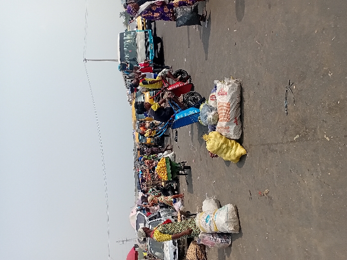 The scene depicts a bustling outdoor market or transit hub in Alasia, Nigeria, under a hazy, light-colored sky