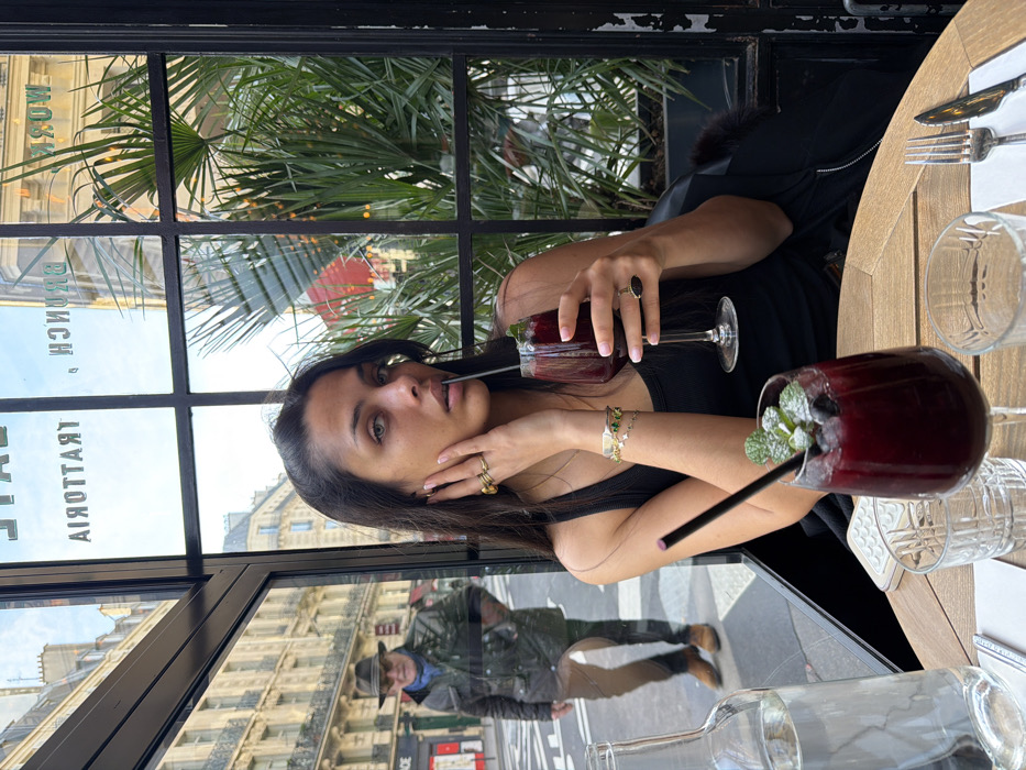 A young woman with long dark hair and light eyes is seated at a wooden cafe table, looking directly at the camera. She wears a black tank top, multiple rings on both hands, and bracelets on her left wrist. In her right hand, she holds a stemmed glass containing a dark red beverage with a black straw. Her left hand rests near her jawline. On the table, another identical beverage garnished with mint and blueberries stands next to a clear glass bottle of water, two empty glasses, and a set of cutlery on a white napkin. Through the large, black-framed window of the cafe, a street scene in the city of Paris, France, is visible. Reversed text on the window indicates "TRATTORIA" and "BRUNCH." An older man wearing a dark fedora, blue scarf, and dark jacket is walking on the sidewalk outside, with his hands in his pockets, moving away from the viewer. Behind him, characteristic light-colored Haussmannian buildings with multiple windows line the street. Green foliage from plants or trees is visible through the window, suggesting an outdoor cafe area or planter boxes. The sky is bright with some clouds.