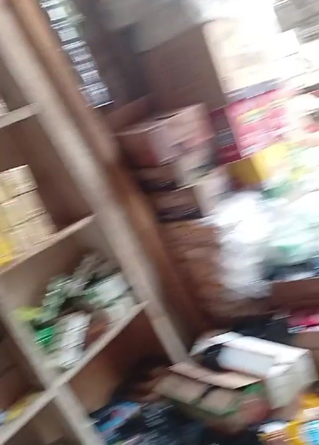 cluttered interior, possibly a store or storage area. There are wooden shelves stocked with various items including boxes, packaged goods, and cans. The floor is strewn with debris, plastic bags, cardboard boxes, and other discarded materials. The lighting is bright, suggesting daylight coming in from a window or doorway. The overall impression is one of disorganization and accumulated clutter.