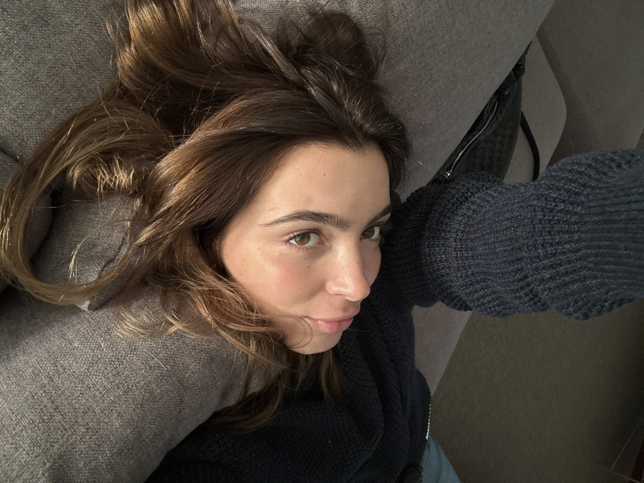 A single light-skinned adult female is depicted from an overhead perspective, positioned in an indoor setting. She has brown hair and light-colored eyes, and her head is resting on a grey, upholstered surface, likely a sofa or bed. She is wearing a dark, possibly navy or charcoal, textured knit garment, consistent with a sweater or jacket, which features a metallic zipper closure. Her right arm (from the viewer's perspective) is raised, indicating she is holding a device, potentially a camera or smartphone, to capture the image. A black, woven-texture bag or clutch with a metallic zipper is visible on the grey upholstered surface to her left. The background is dark and out of focus, suggesting subdued lighting. The specific location within Nogueira e Silva Escura, Portugal, cannot be identified from the visual content of the image.