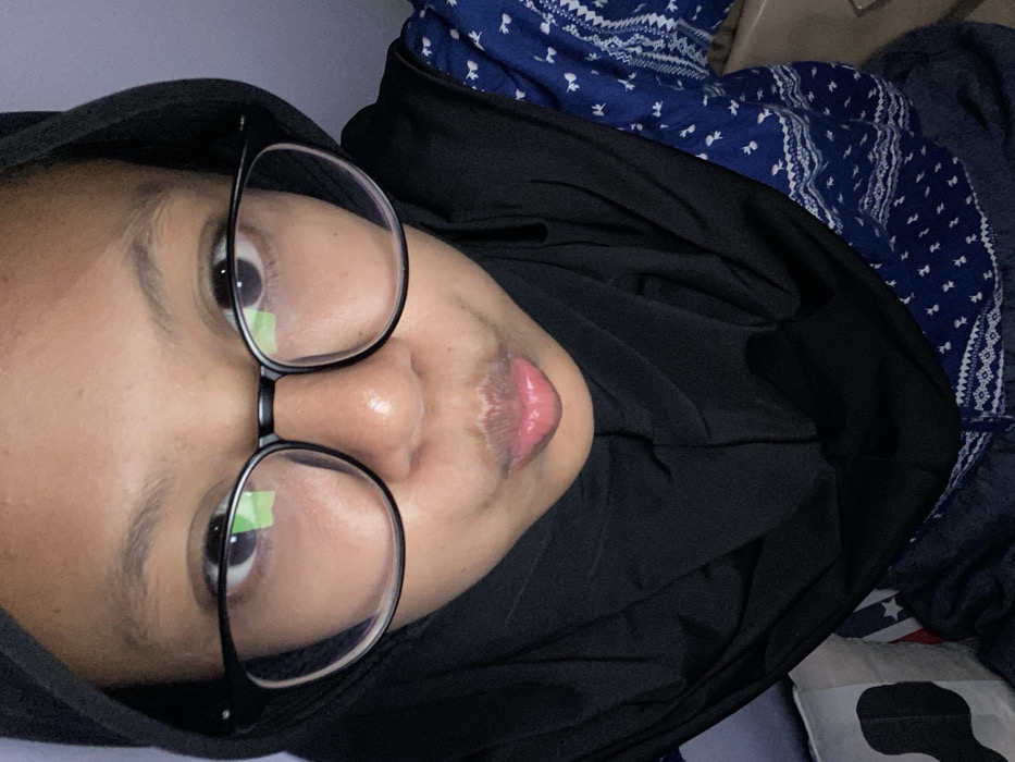 The image displays a close-up, slightly high-angle portrait of an individual in Kebonsari, Indonesia, positioned indoors. The subject, an individual with medium-dark skin, looks directly at the camera with dark, open eyes. They are wearing black-framed glasses, which show reflections of light sources. A black hijab covers their head and neck, draping over the shoulders. Their lips are pursed into a distinct pouting gesture. A blue shirt featuring a white, intricate pattern is visible beneath the hijab on the right side of the frame, with a darker blue or denim-like fabric present below it. The background is softly blurred, showing a light-colored object with a black irregular shape on the left and a muted, light brown surface on the right, consistent with an indoor environment with ambient lighting.