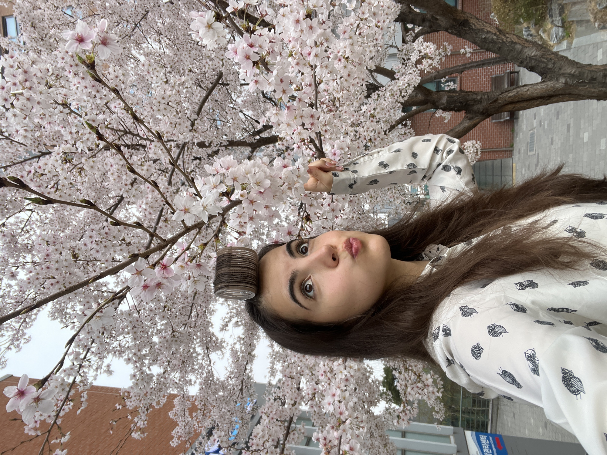 A young woman poses for a selfie outdoors in Daegu, South Korea. A cylindrical object, possibly a stack of coasters, balances on her head. She is wearing a white blouse with black owl patterns. Behind her is a cherry blossom tree in full bloom, and parts of buildings are visible in the background. A sign with Korean text and blue and red markings is partially visible in the lower right. The image is slightly tilted to the left.