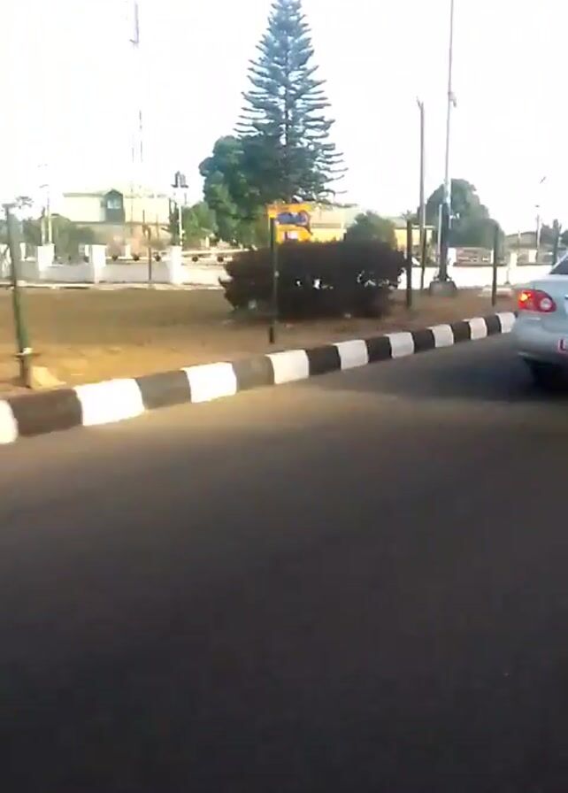 The camera is mounted on a moving vehicle, likely a motorcycle or scooter, traveling down a paved road. The road is bordered by a curb painted with alternating black and white stripes. Across the road, there's a low white wall, behind which are trees, poles, a communications tower, and a sign in a yellow frame. The sky is clear and blue. A car is seen driving in the opposite direction.