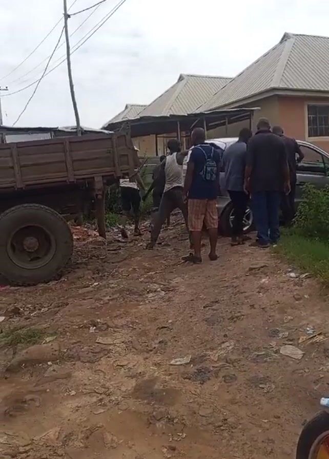 dirt road with a group of men standing near a silver car and a yellow truck. The truck has a wooden cargo bed. The road is littered with debris. There are houses in the background. One man is walking toward the front of the truck.