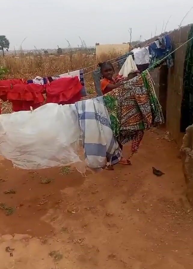 A young Black girl with her hair in two buns is standing behind a clothesline, smiling and interacting with someone who is filming. The clothesline is strung between a wall and a post, both made of concrete, and has a variety of clothing items hanging on it. The ground is dirt with some vegetation and trash scattered around. In the background, there is a field of dry grass. The weather appears overcast.