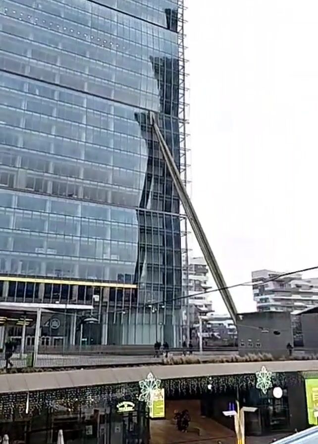 A low-angle shot pans across an urban cityscape. Dominating the scene are towering, modern skyscrapers with glass facades, one having prominent support beams. A blue and white snow tubing run, labeled "ICE & FUN," sits amidst the urban landscape, active with people enjoying the attraction. Crowds of pedestrians stroll along walkways and through outdoor shops below. The cloudy sky provides a neutral backdrop. Overhead, a wire suspends a series of modern lamp fixtures. The scene appears to be an outdoor shopping or entertainment district.