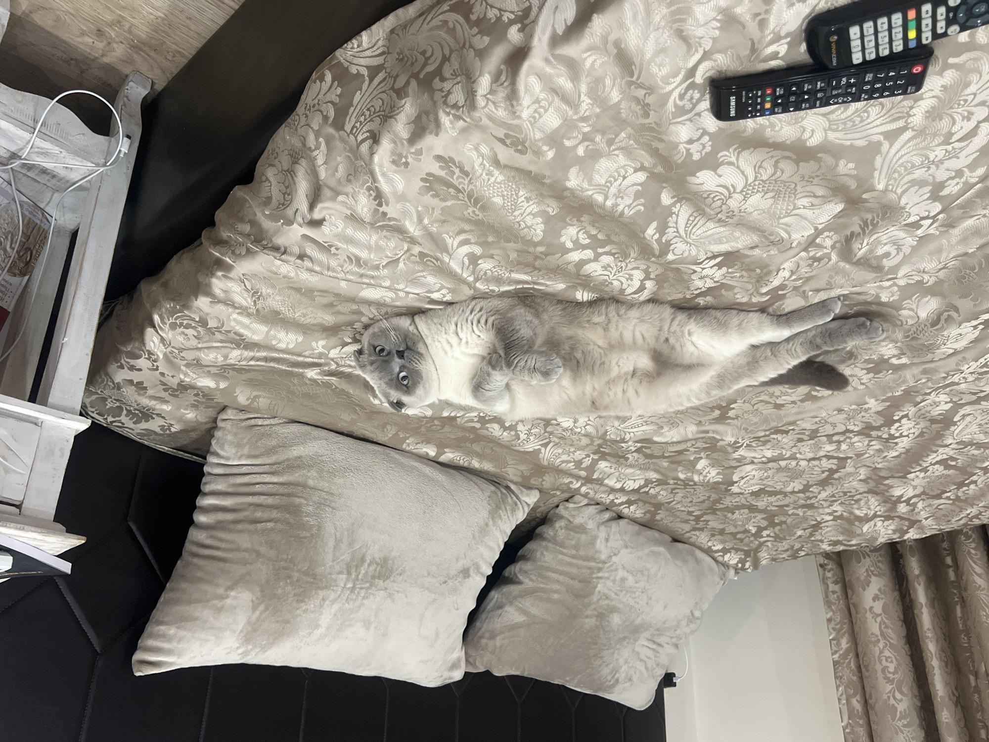 A gray cat lies on its back on a bed with a floral-patterned comforter. Two remote controls are placed near the top-right corner of the bed. There are two gray pillows on the left side of the bed. The bed is next to a black headboard. A white nightstand with items on it is to the left of the headboard. A curtain hangs in the lower right corner. The location is inside a room but the city of Nesebar, Bulgaria cannot be determined.