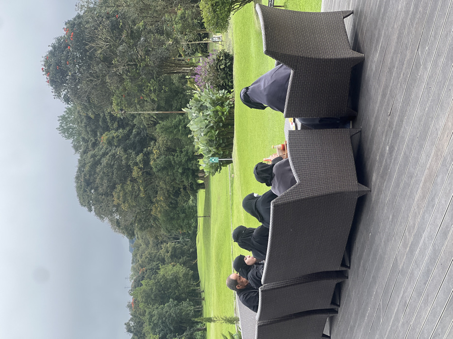 This image captures an outdoor dining scene on a deck overlooking a golf course landscape in Wanagiri, Indonesia, under an overcast sky